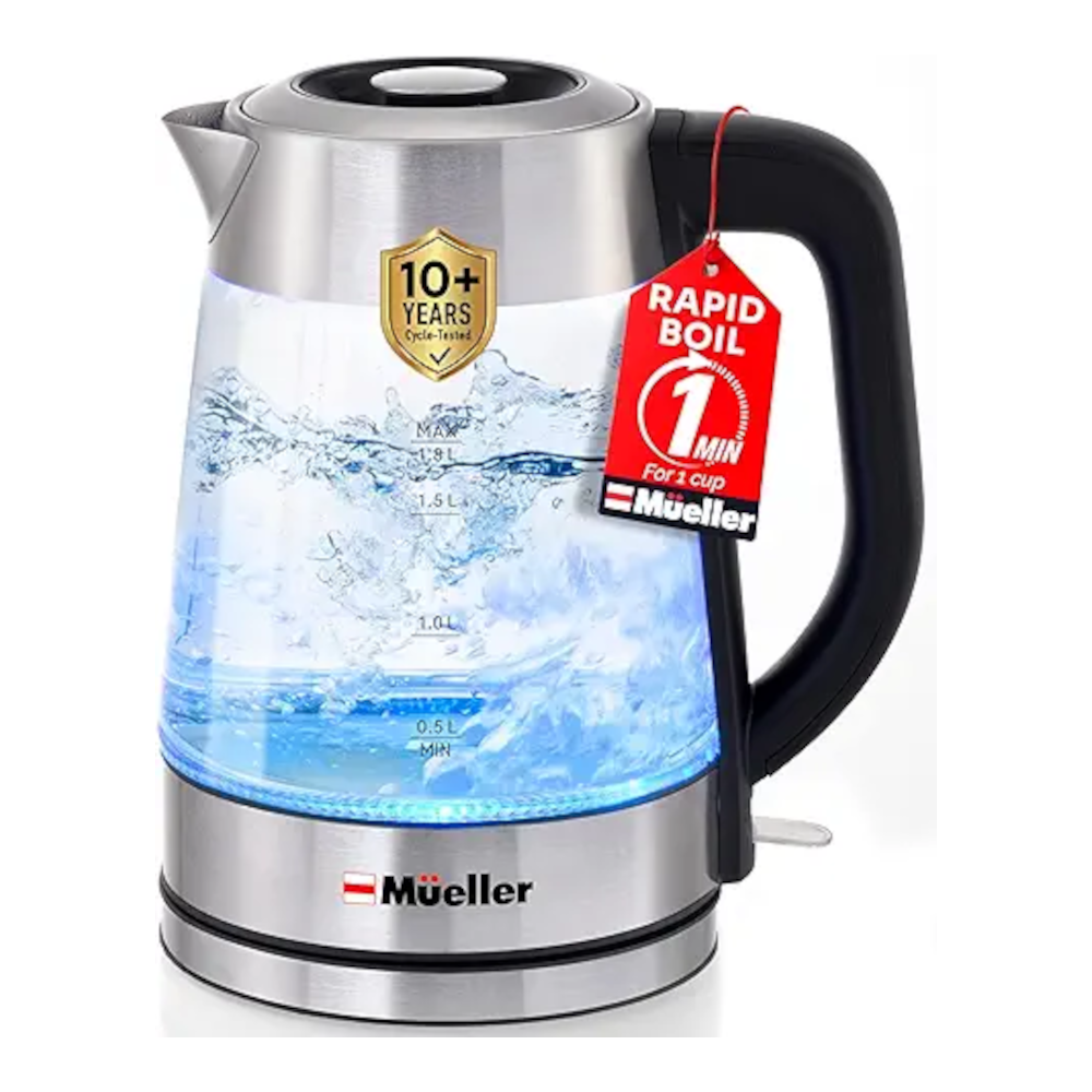 The Mueller Rapid Boil Kettle features a borosilicate glass body that resists thermal shock and provides clear visibility while heating water.