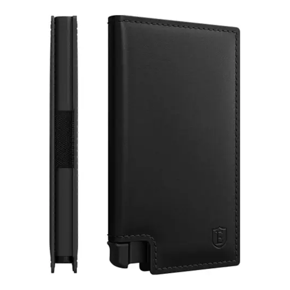 The Ekster Parliament wallet combines a traditional leather wallet style with modern card-access technology. With the push of a button, the wallet ejects cards in a fan layout so you can easily grab the one you need.