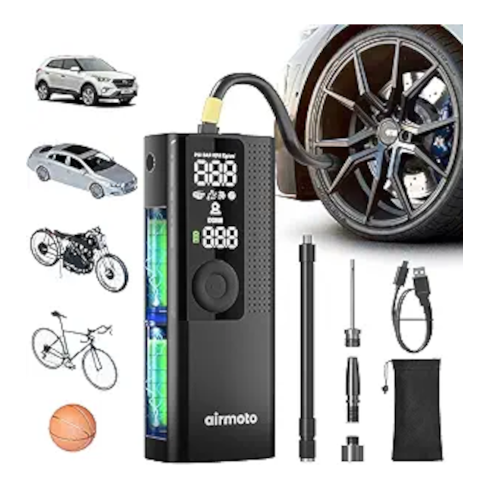 The Airmoto Tire Inflator is a compact cordless air pump designed for quick and convenient tire inflation. Its small size makes it easy to store in a glove box or trunk, making it ideal for emergency use.