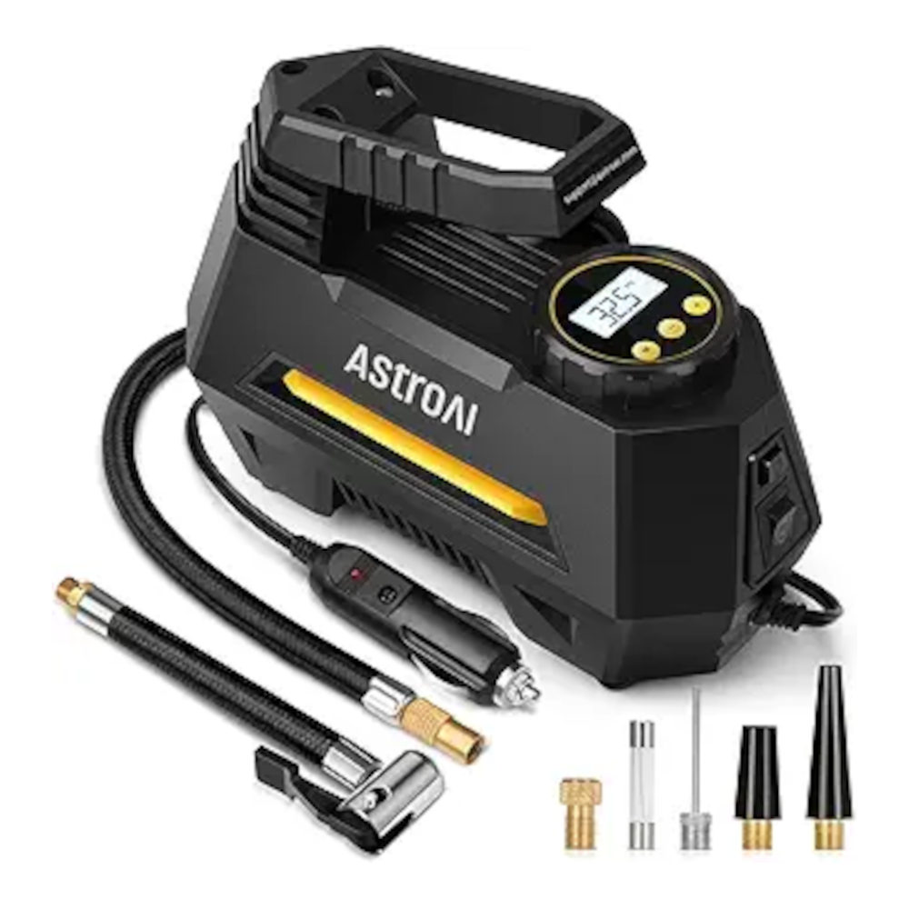 The AstroAI Portable Tire Inflator is one of the most popular air compressors for cars thanks to its simple design and reliable performance. It plugs directly into a vehicle’s 12V outlet and quickly inflates standard car tires.
